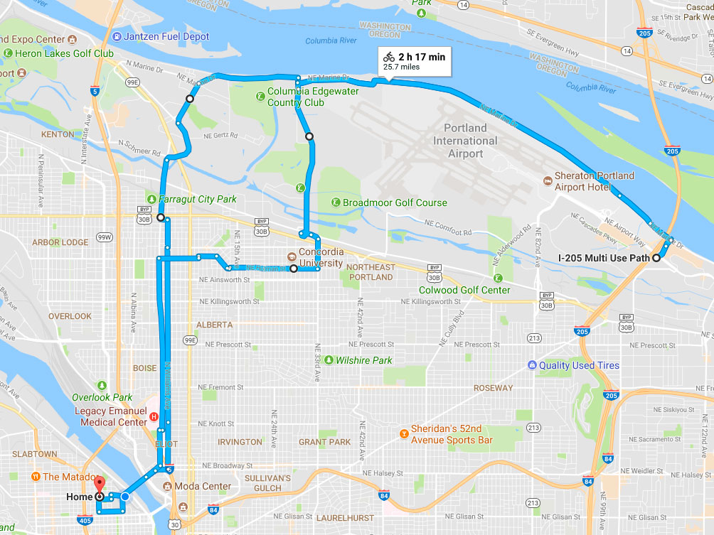 It was about 26 miles altogether. Stopped and watched the planes take off from PDX for a little while. It was tremendous along the river, and decent-to-good on the ride back.